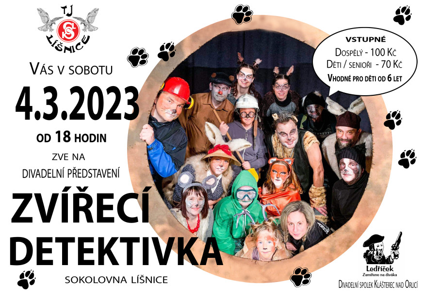 T.J. Sokol Líšnice zve všechny malé i velké příznivce divadla na představení Zvířecí detektivka, které v sobotu 4.3.2023 od 18 hodin zahrají ochotníci z Klášterce nad Orlicí. Obsah Vám neprozradíme, to by pak nebyla detektivka. Představení je vhodné pro děti od 6 let. O občerstvení bude postaráno. Těšíme se na Vás.