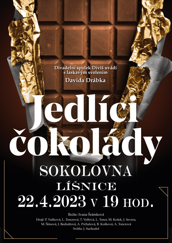 TJ Sokol Líšnice ve spolupráci se Spolkem divadelních ochotníků Diviš Žamberk uvede v líšnické sokolovně v sobotu 22.4.2023 od 19 hodin divadelní představení JEDLÍCI ČOKOLÁDY.