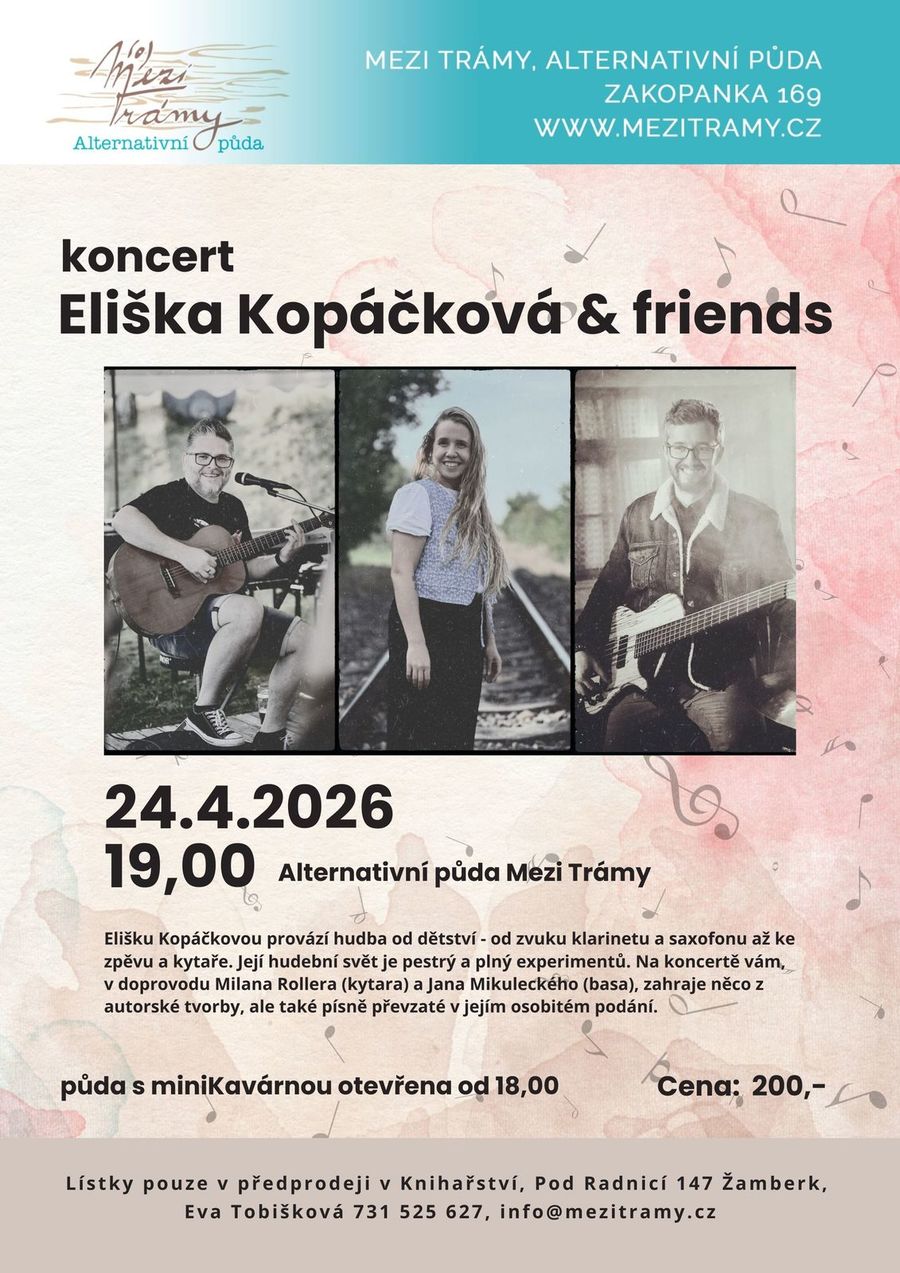Přijďte si užít jedinečný koncert zpěvačky Elišky Kopáčkové, jejíž hudební cesta je pestrá – od klarinetu a saxofonu až po zpěv a kytaru.