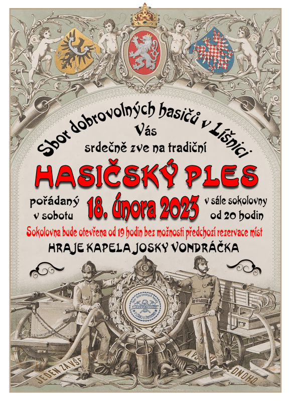 Sbor dobrovolných hasičů v Líšnici si Vás dovoluje pozvat na tradiční Hasičský ples, který se uskuteční v sobotu 18. února 2023 od 20 hodin v místní sokolovně.