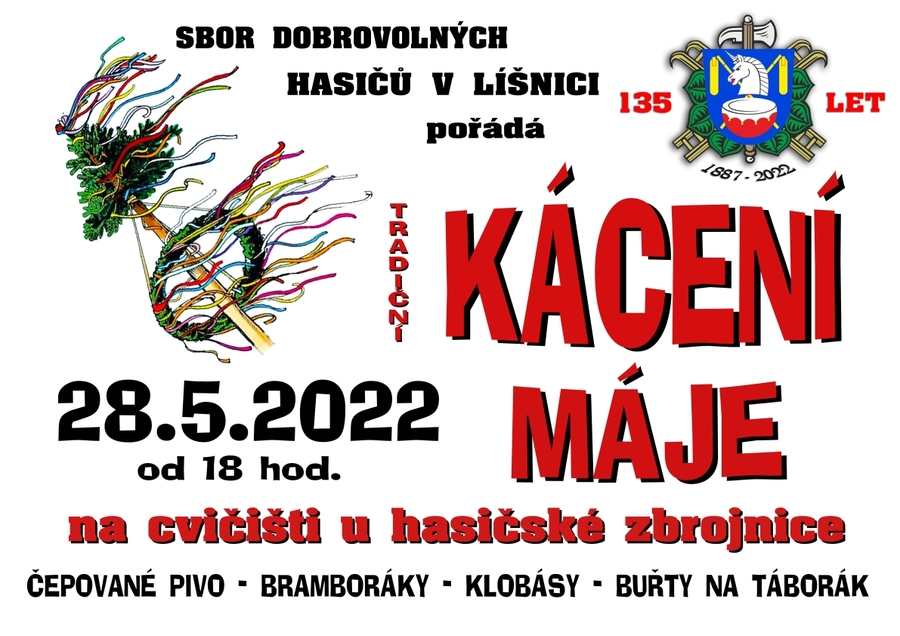 Sbor dobrovolných hasičů Vás zve na tradiční Kácení máje, které se uskuteční v sobotu 28.5.2022 od 18 hodin na cvičišti za hasičskou zbrojnicí. Můžete se těšit na tradiční poctivé bramboráky, uzené klobásky, špekáčky na oheň, točené pivo a něco ostřejšího na zahřátí. Každý si určitě vybere. Komu by byla zima, bude se moci ohřát u táboráku. Těšíme se na Vás.