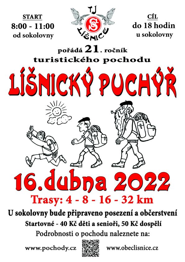 TJ Sokol Líšnice Vás zve na XXI. ročník turistického pochodu „Líšnický puchýř“, jehož start se bude konat trochu netradičně v sobotu 16. dubna 2022 od 8 do 11 hodin od sokolovny v Líšnici. Budou pro vás připraveny 4 trasy vedoucí krásami našeho kraje, každý účastník obdrží čaj, oplatek a diplom. V cíli bude připraveno občerstvení z naší domácí kuchyně, které jistojistě doplní energii i těm nejvyčerpanějším pochodníkům. Srdečně se těšíme na hojnou účast.