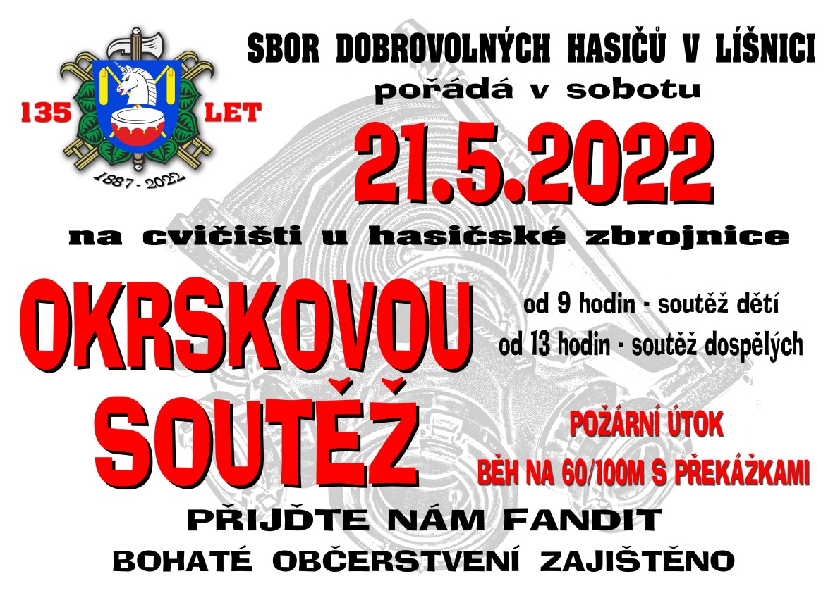 Po 5 letech se k nám do Líšnice v sobotu 21.5.2022 vrací soutěž v požárním sportu, ve kterém se poměří své síly družstva z 26. okrsku. Kdo bude nejlepší? Líšnice, Žamberk, Kameničná, Dlouhoňovice nebo Helvíkovice? Soutěžit budeme v požárním útoku, jednotlivcích a pořaďáku, který se sice do celkového hodnocení nepočítá, je u něj ale největší sranda. Ve stejných disciplínách budou soutěžit i děti, kterým bude patřit dopoledne. Začínáme v 9 hodin. Odpoledne se dráhy prodlouží a budou se moci předvést dospělí.