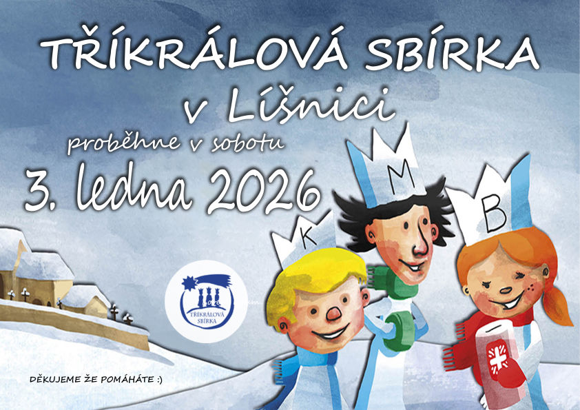 Tradiční Tříkrálová sbírka pořádaná Charitou Česká republika proběhne v Líšnici v sobotu 3.1.2026, kdy budou skupinky koledníků koledovat dům od domu. Její výtěžek je určen především na podporu charitních služeb v našem regionu. Děkujeme za milé přijetí koledníků. Děkujeme, že pomáháte :)