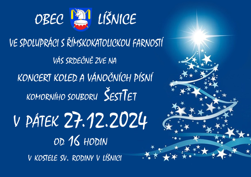Obec Líšnice ve spolupráci s římskokatolickou farností Vás srdečně zve na koncert koled a vánočních písní komorního souboru Šest TET v pátek 27.12.2024 od 16:00 hodin v kostele sv. Rodiny v Líšnici.
