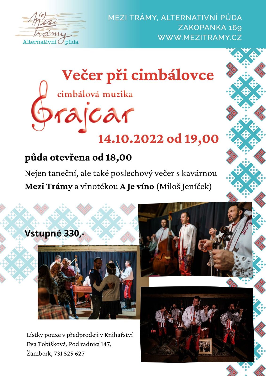 Přidejte se k nám do Zakopanky 14.10.2022 od 19,00 a užijte si poslechovou i taneční cimbálovou muziku Grajcar z Dolních Bojanovic. Budete moci ochutnat něco dobrého z naší kavárny a nebude chybět ani ochutnávka vína, kterou k nám doveze "A je víno - Miloš Jeníček!.