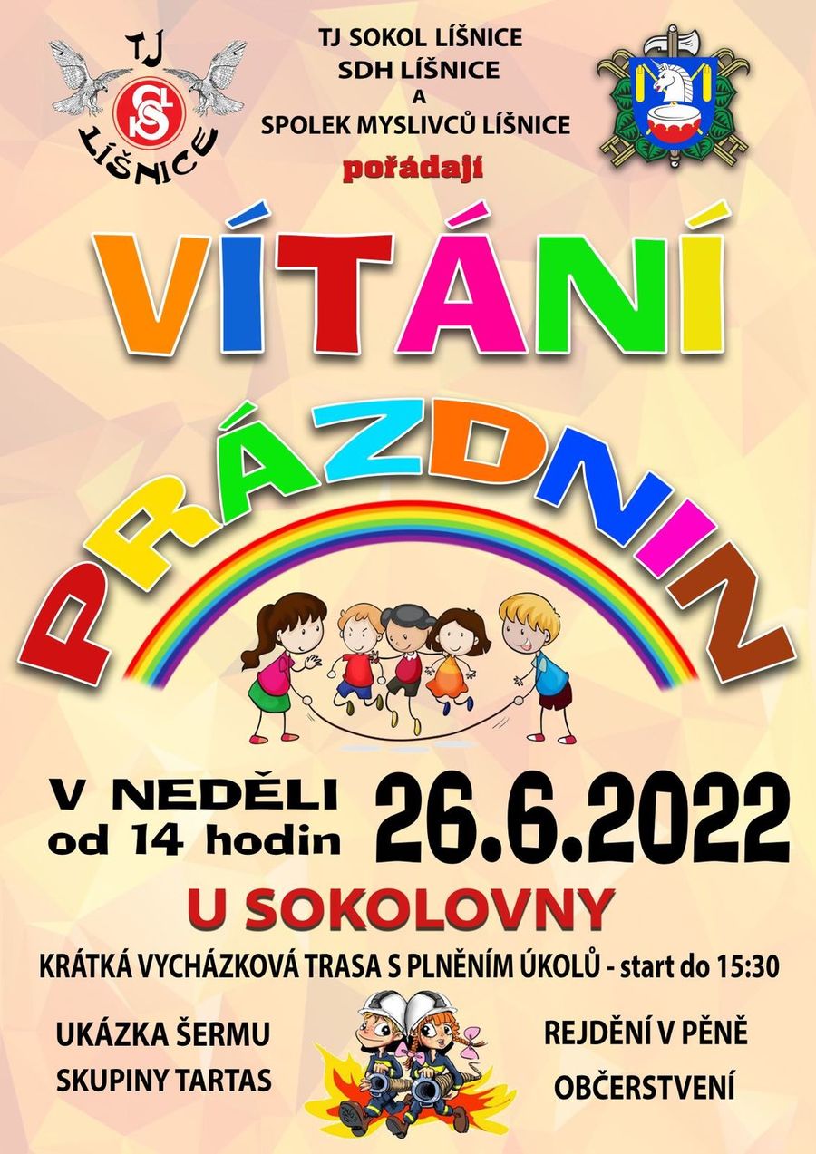 TJ Sokol Líšnice, Sbor dobrovolných hasičů v Líšnici a Spolek myslivců v Líšnici Vás zvou na Vítání prázdnin - zábavné odpoledne pro celou rodinu, které se uskuteční u sokolovny a sportovním areálu v neděli 26.6.2022 od 14 hodin. Připravena bude krátká procházková trasa s plněním úkolů (start do 15:30), šermířské vystoupení skupiny Tartas a rejdění v mýdlové pěně (náhradní oblečení a ručník s sebou). Samozřejmostí je občerstvení a dostatek nápojů pro dodržování pitného režimu. Těšíme se na Vás. Akce se koná za každého počasí.