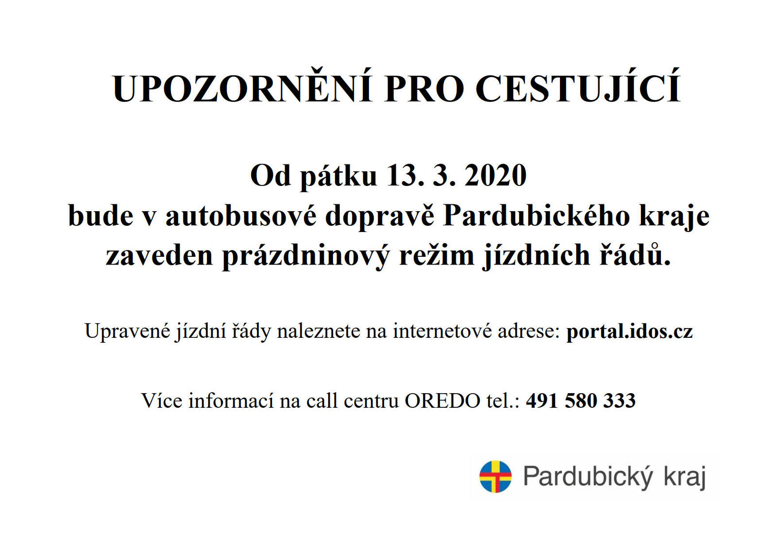 V souvislosti s přerušením výuky na školách přistoupil Pardubický kraj k omezení provozu autobusové dopravy. Ode dne 13.3.2020 bude zahájen tzv. prázdninový režim jízdních řádů, což znamená že dojde k omezení provozu vybraných spojů a to až do doby zahájení výuky. Železniční doprava není tímto opatřením dotčena.