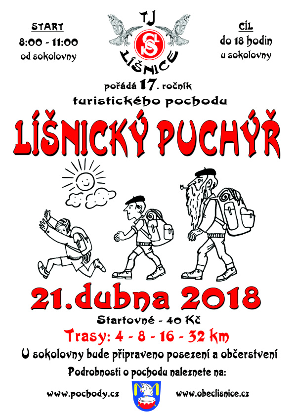 TJ Sokol Líšnice Vás zve již na XVII. ročník turistického pochodu „Líšnický puchýř“, jehož start se bude konat dne 21. dubna 2018 od 8 do 11 hodin od sokolovny v Líšnici. Budou pro vás připraveny 4 trasy vedoucí krásami našeho kraje, každý účastník obdrží čaj, oplatek a diplom. V cíli bude připraveno občerstvení z naší domácí kuchyně, které jistojistě doplní energii i těm nejvyčerpanějším pochodníkům. Srdečně se těšíme na hojnou účast.